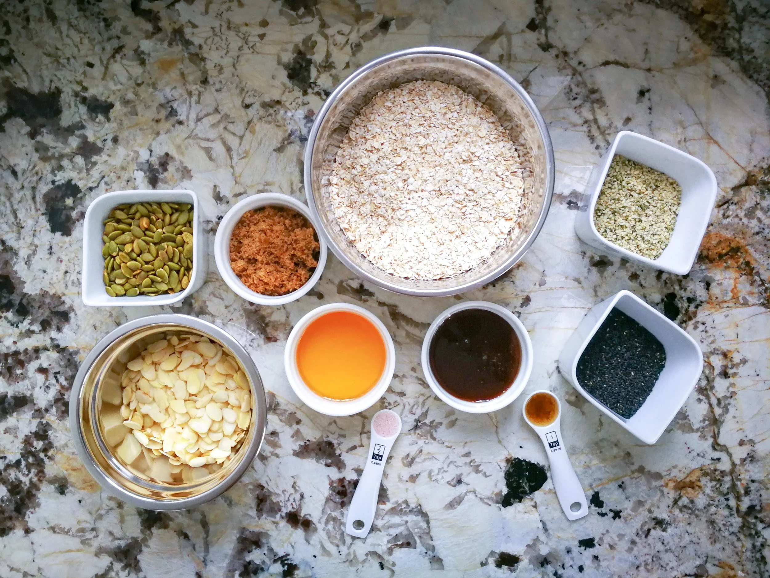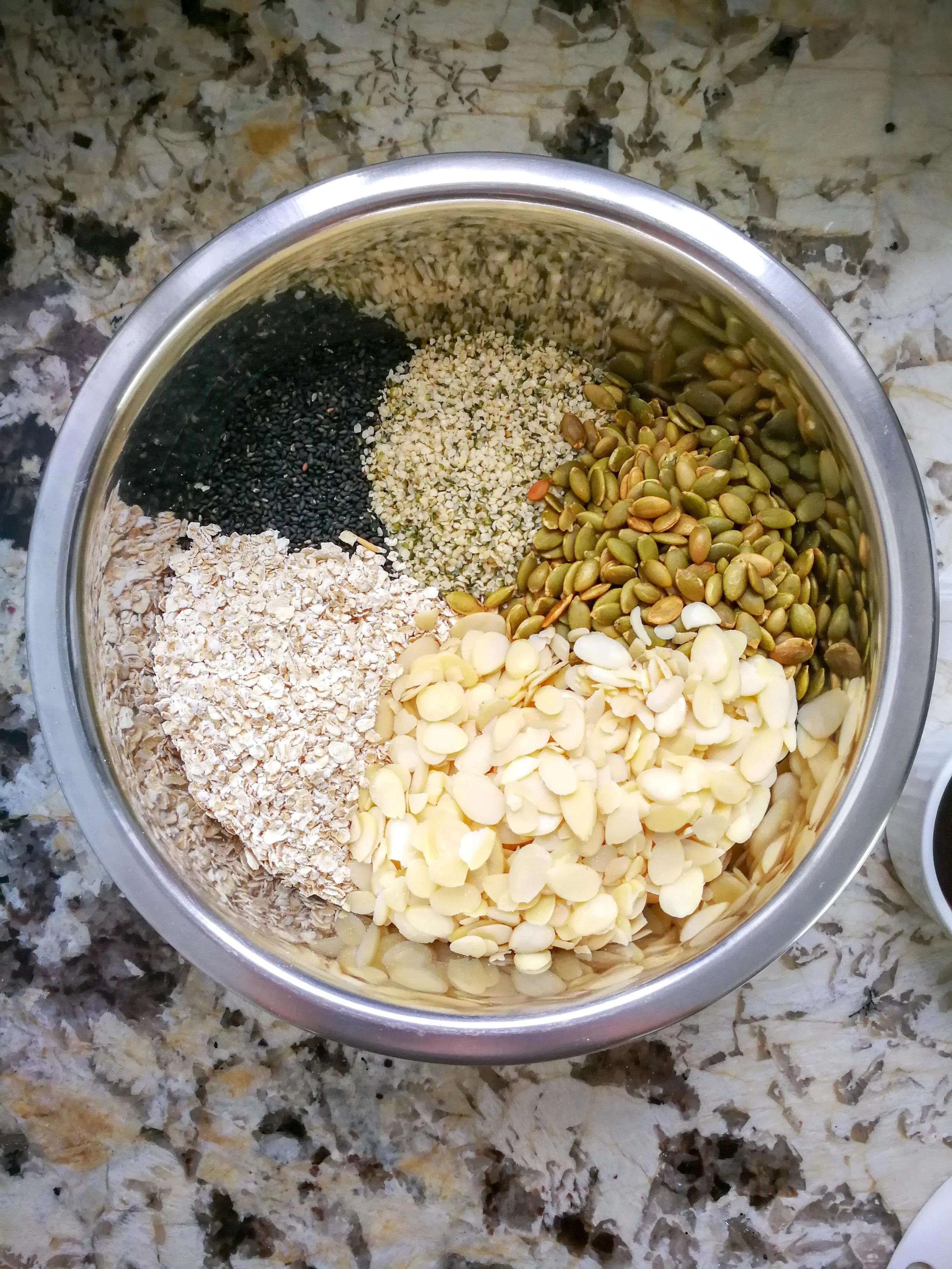 Preheat oven at 325°F. Combine oatmeal, pumpkin seeds, sesame seeds, almonds and hemp seeds in a large bowl.