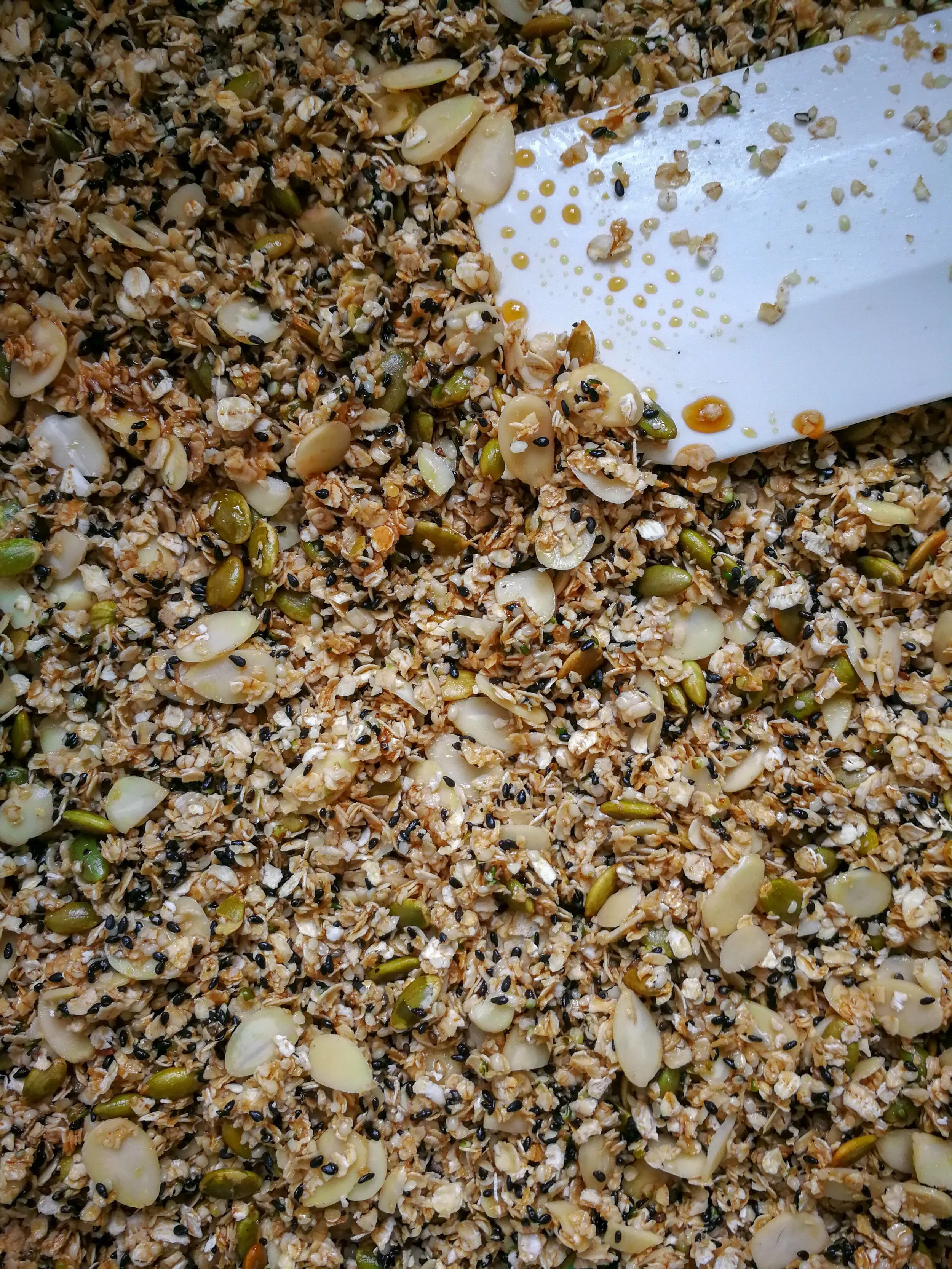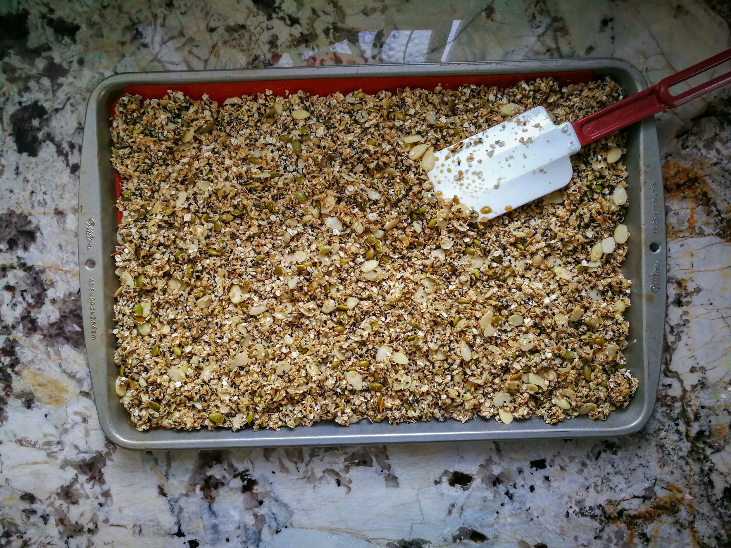 Add hot honey mixture to dry ingredients. Combine everything and spread mixture on a large baking sheet with parchment paper or a silpat silicone mat. Bake for 10 minutes.