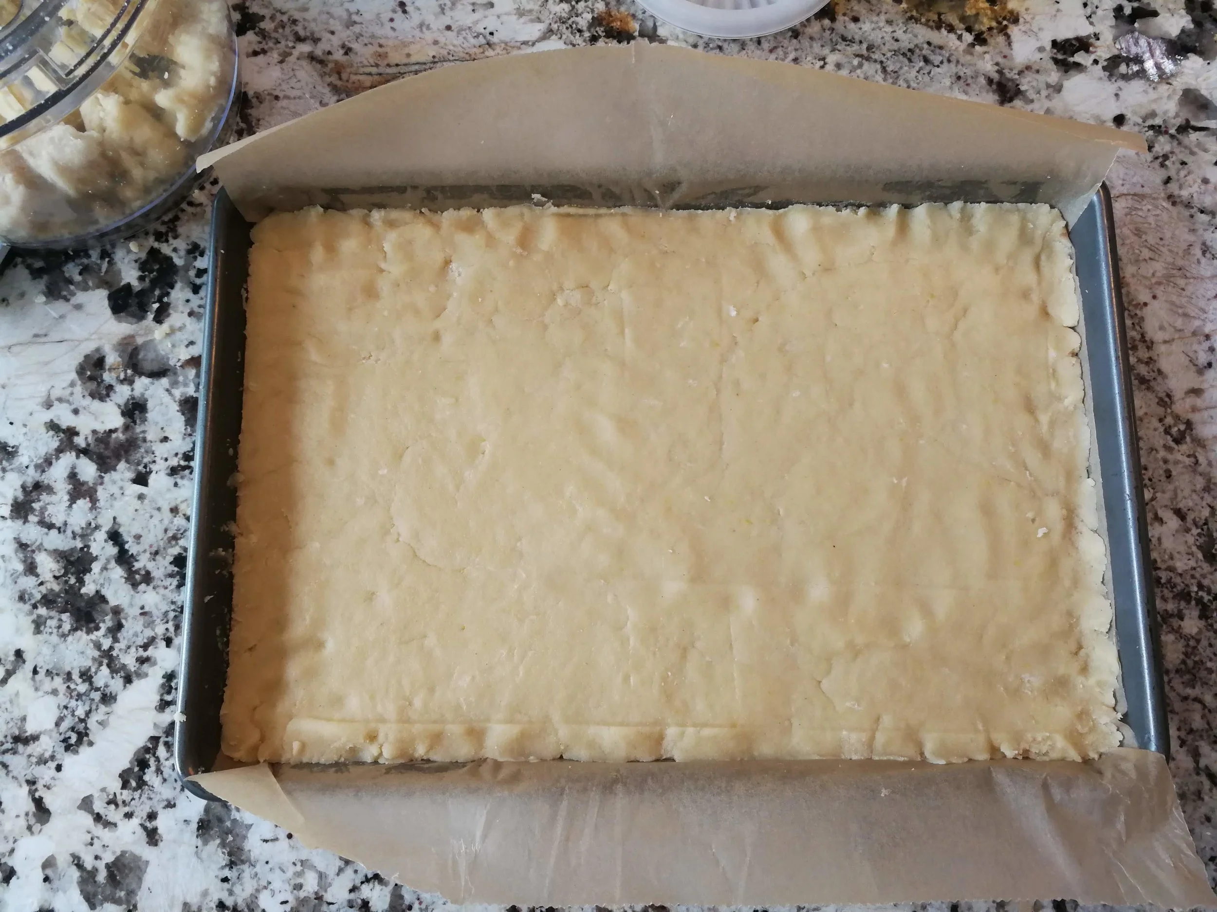 Press about 3/4 of dough firmly in bottom of baking tray using your hands or the back of a drinking glass to help create an even layer. Put tray in fridge so dough can chill. Mix the rest of the dough with the blanched sliced almonds and put in fridge as well.