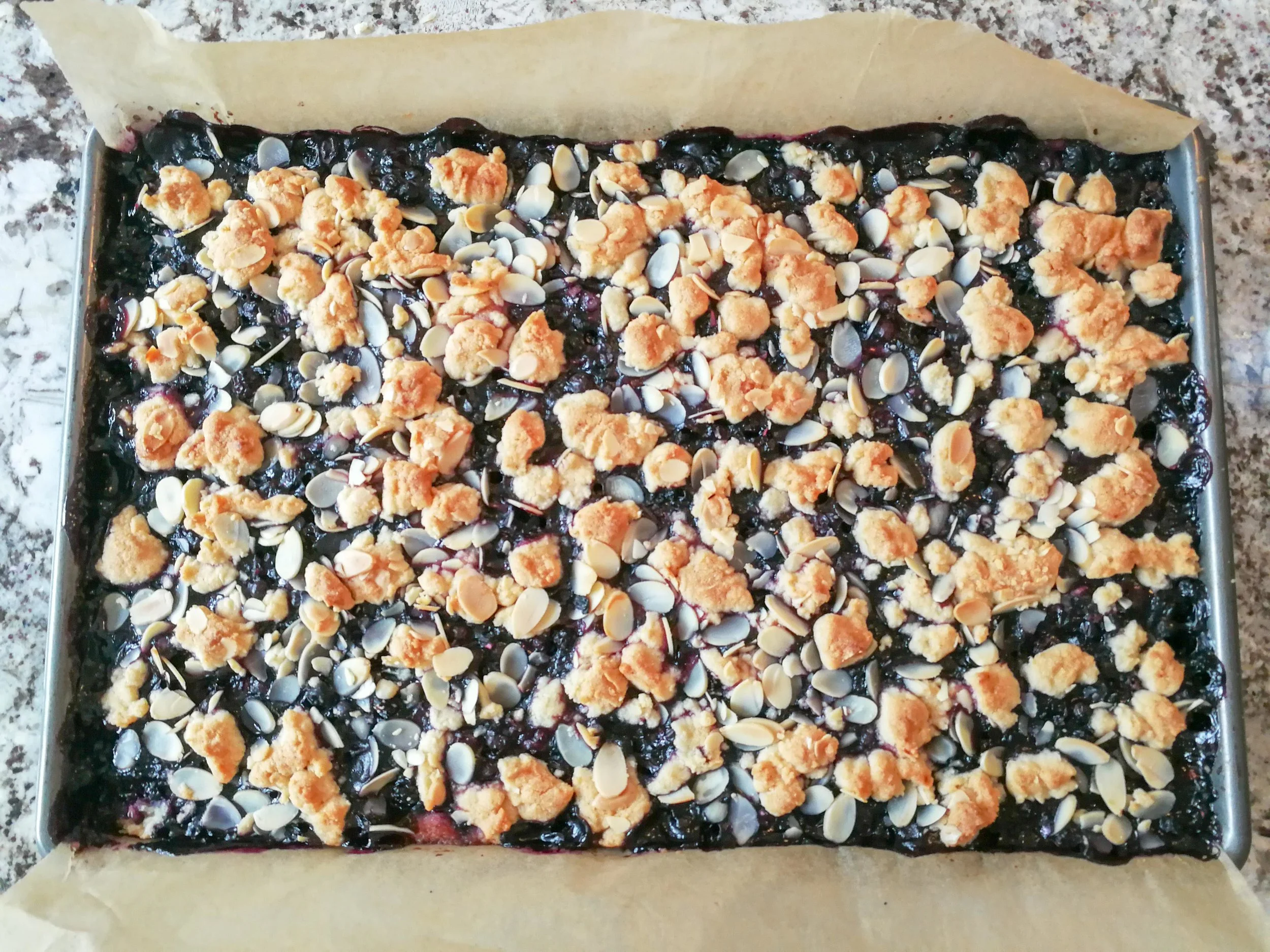 Place baking pan in the middle rack of oven and bake for about 40 minutes until crumble topping is golden and filling is bubbling. Cool completely before attempting to slice into bars.