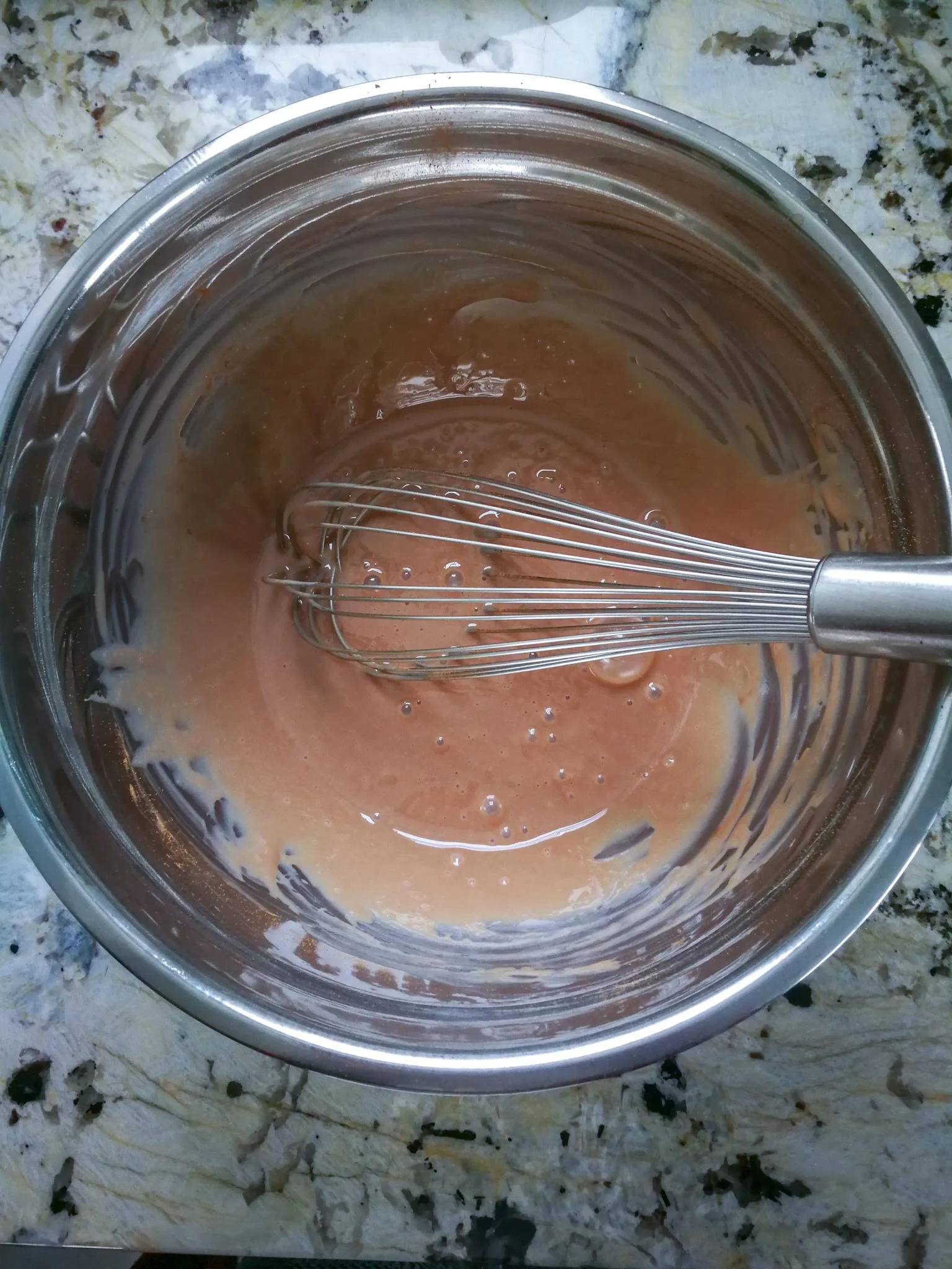 in a large bowl, mix sweetened condensed milk and cocoa powder by hand with a whisk until smooth.
