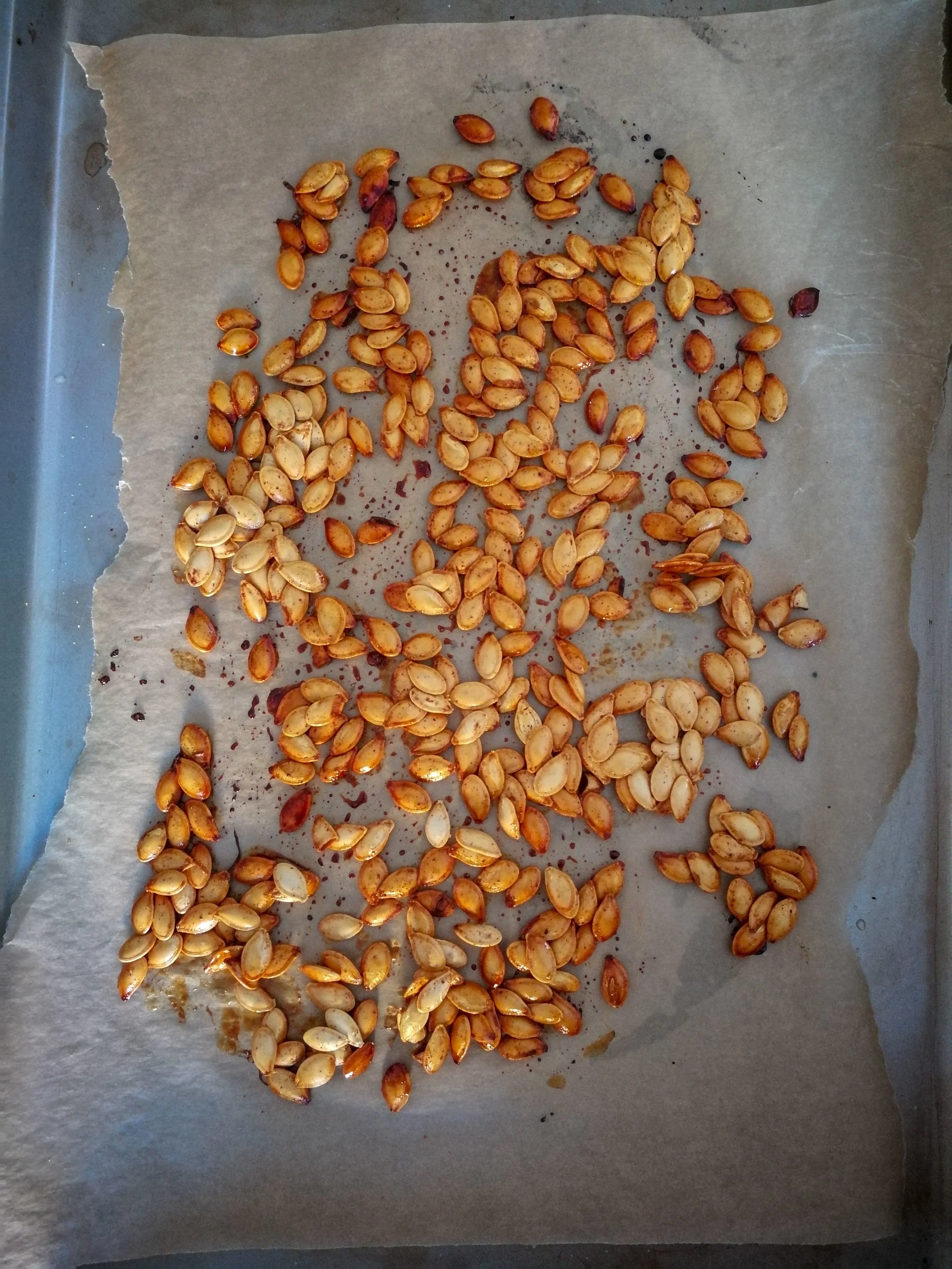For roasted pumpkin seeds: rince seeds and pat dry. Coat seeds with honey or maple syrup (if vegan), Chinese 5-spice and salt. Place on baking sheet with parchment paper and bake for 25 minutes at 375°F.