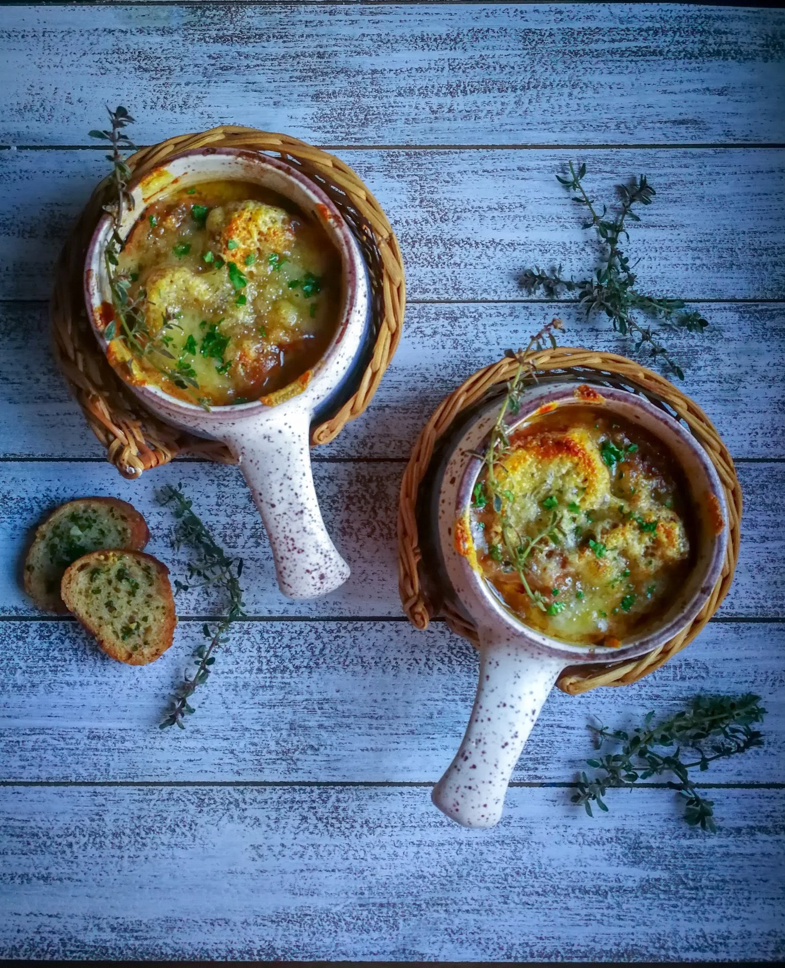 Set oven at Broil (500°F). Pour soup in oven-safe bowls. Top soups with croutons and add grated or thinly sliced Swiss cheese to cover the croutons. Place bowls on top rack of the oven and let broil until cheese has bubbled and browned. Bon Appétit!