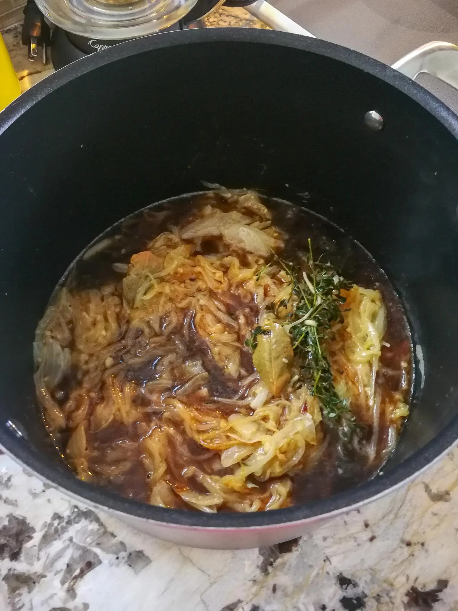 Add beef broth and bring to a boil. Lower heat and let simmer for about 10 minutes. Add salt, brown sugar, Worcestershire sauce and fresh cracked pepper. Discard thyme bunch and bay leaves.