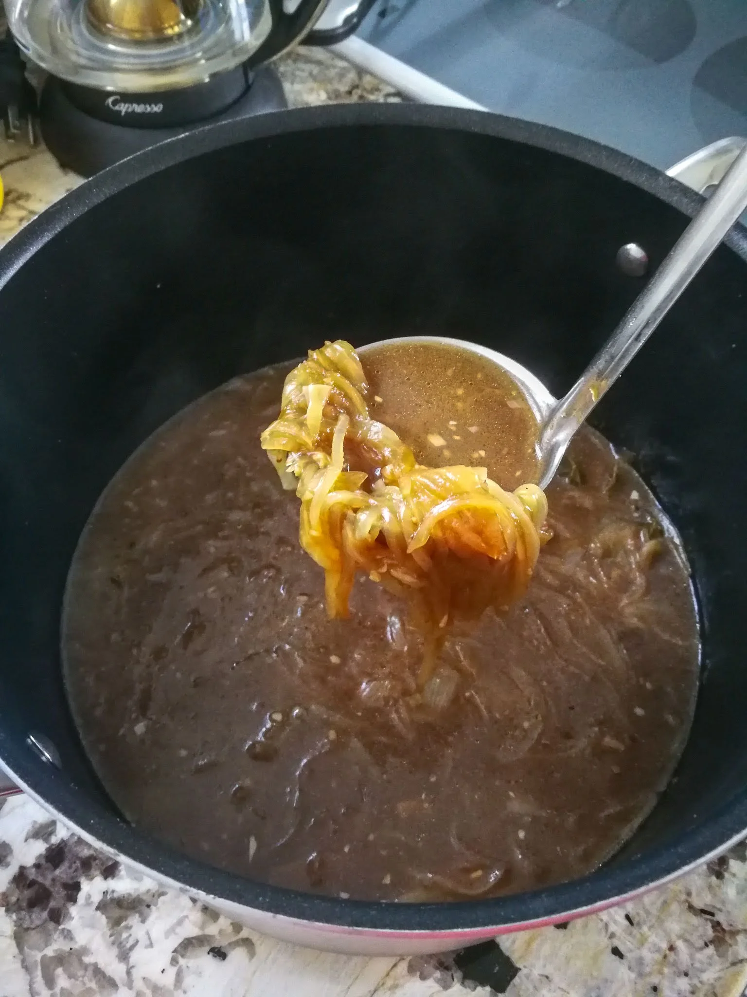 Cook onions on medium to low heat for about 30-45 min, stirring occasionally so onions don’t stick or burn. The end result should be a light brown colour:
