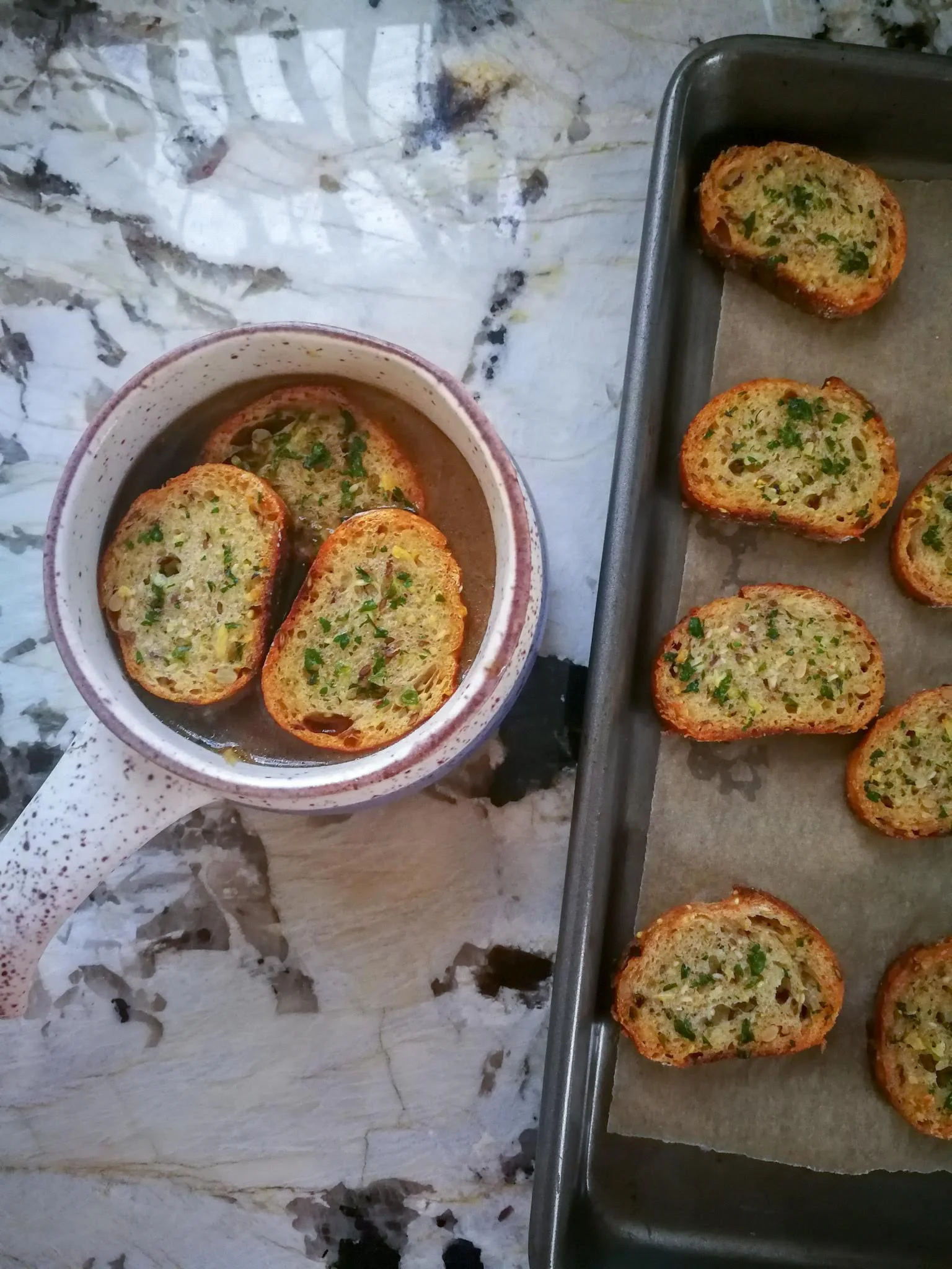 Cut baguette into croutons and place on baking tray. Spread garlic butter on each croutons and bake for 15 minutes at 350°F. Store in the fridge for 2 weeks or can be kept in the freezer for up to a year.