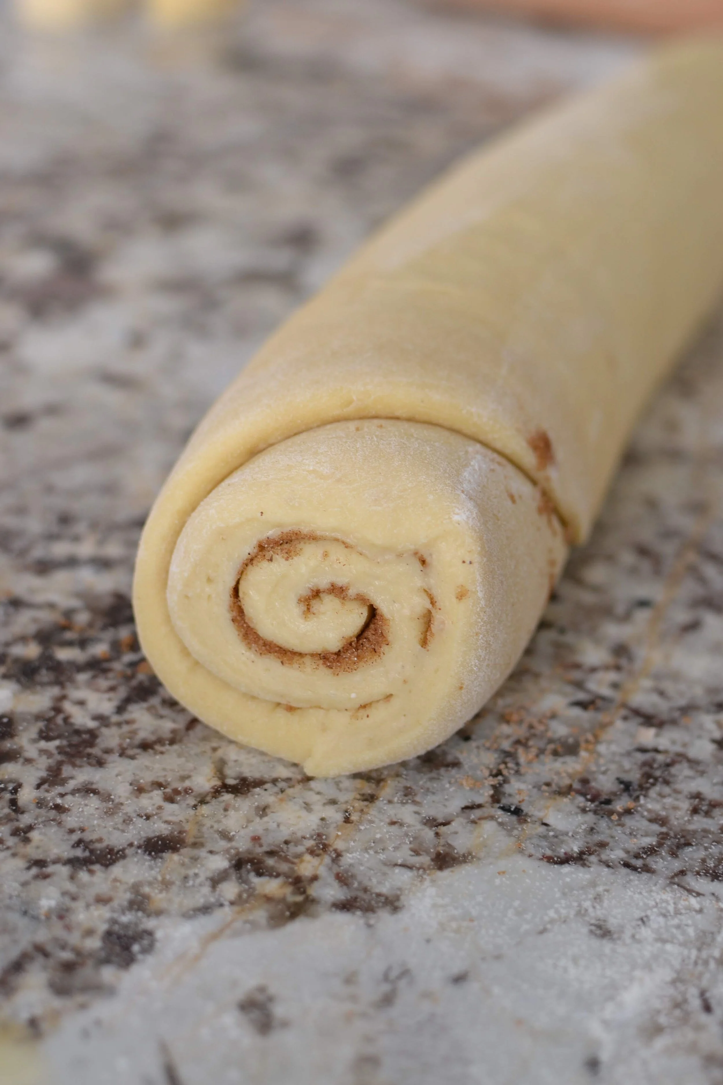 Starting at the long edge, roll up the dough like a jelly-roll. Pinch the seam to seal and leave the ends open.